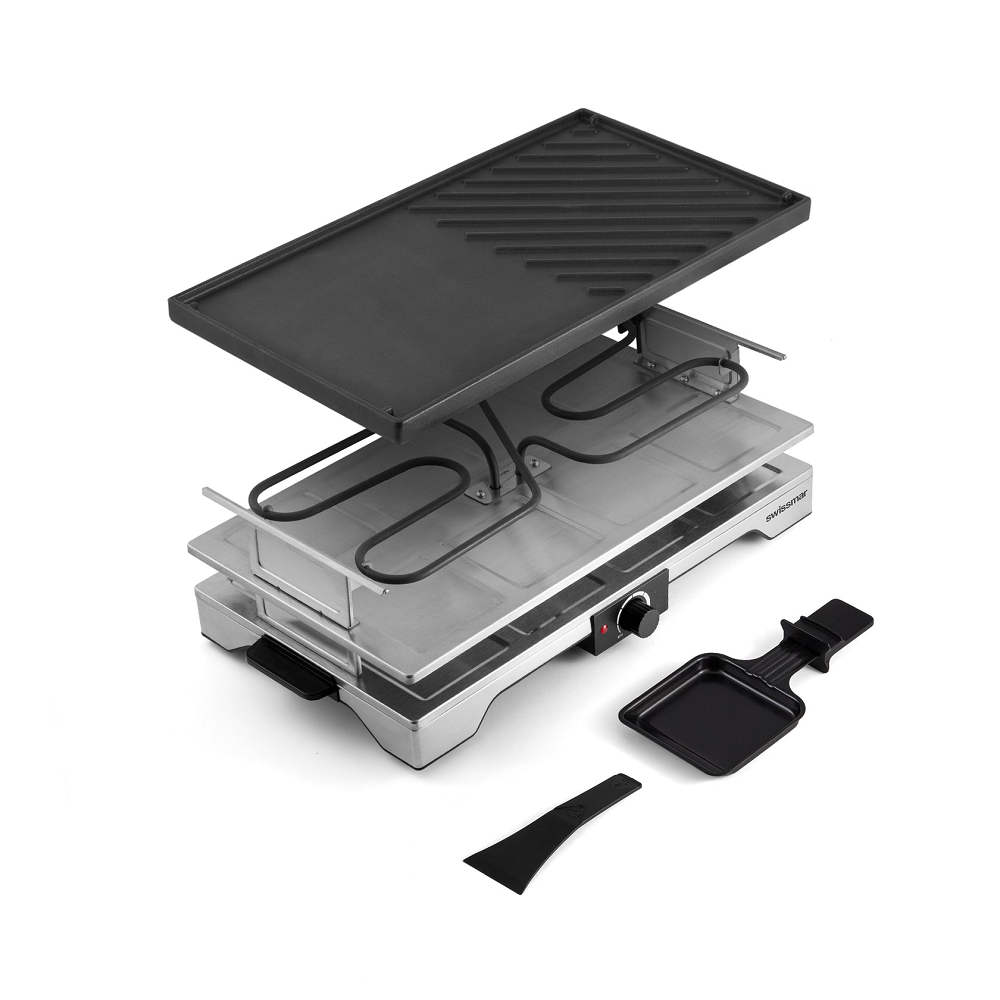 - Set includes: 1.8-meter power cord length, 8 raclette dishes, 8 heat-resistant spatulas