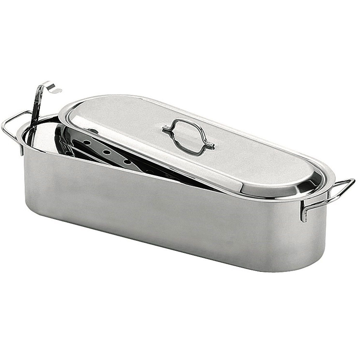 The long size allows you to poach a whole fish or several fish fillets. Constructed of durable stainless steel, it can be used in the oven or across two burners on the stovetop and cooks delicate fish evenly and preserves moisture.