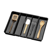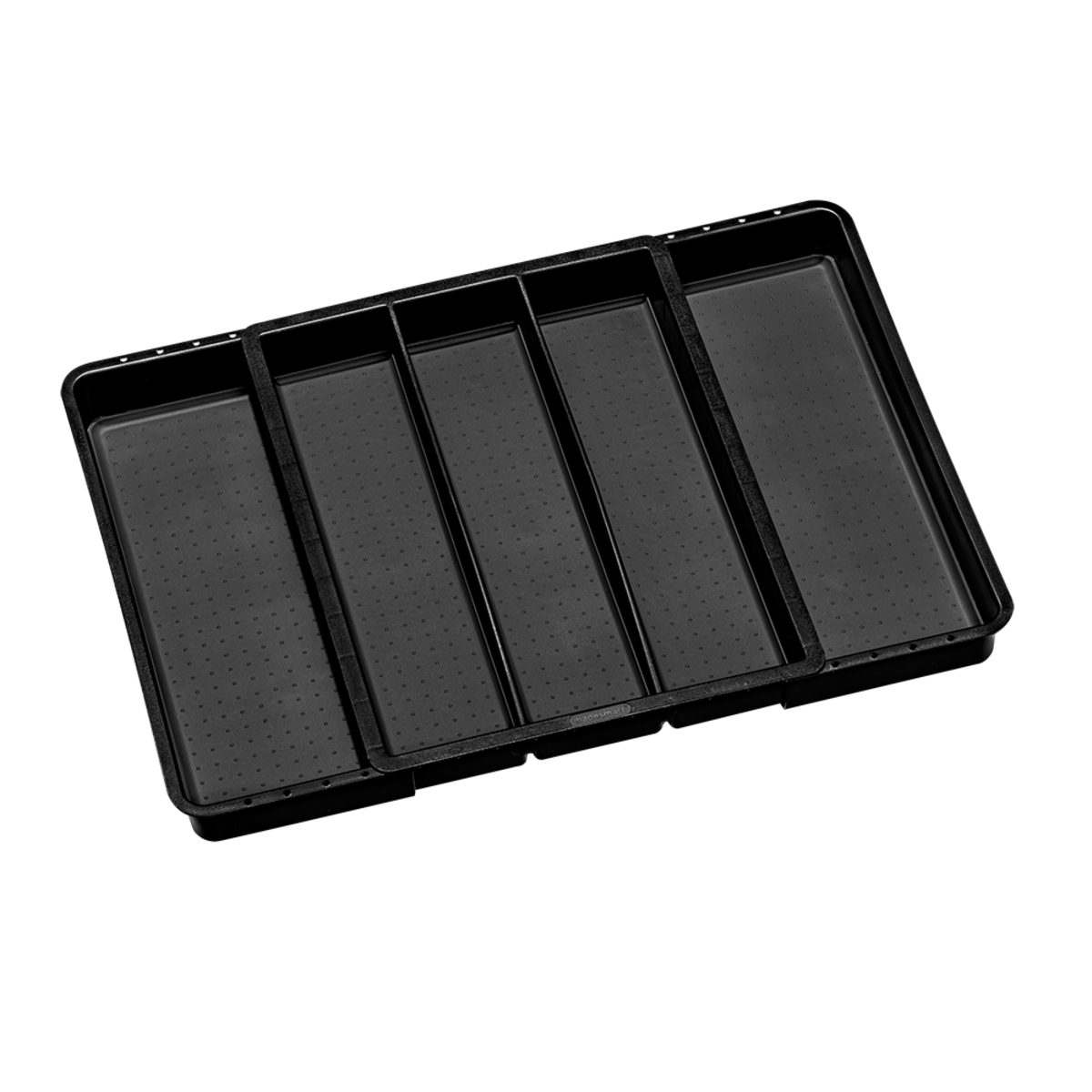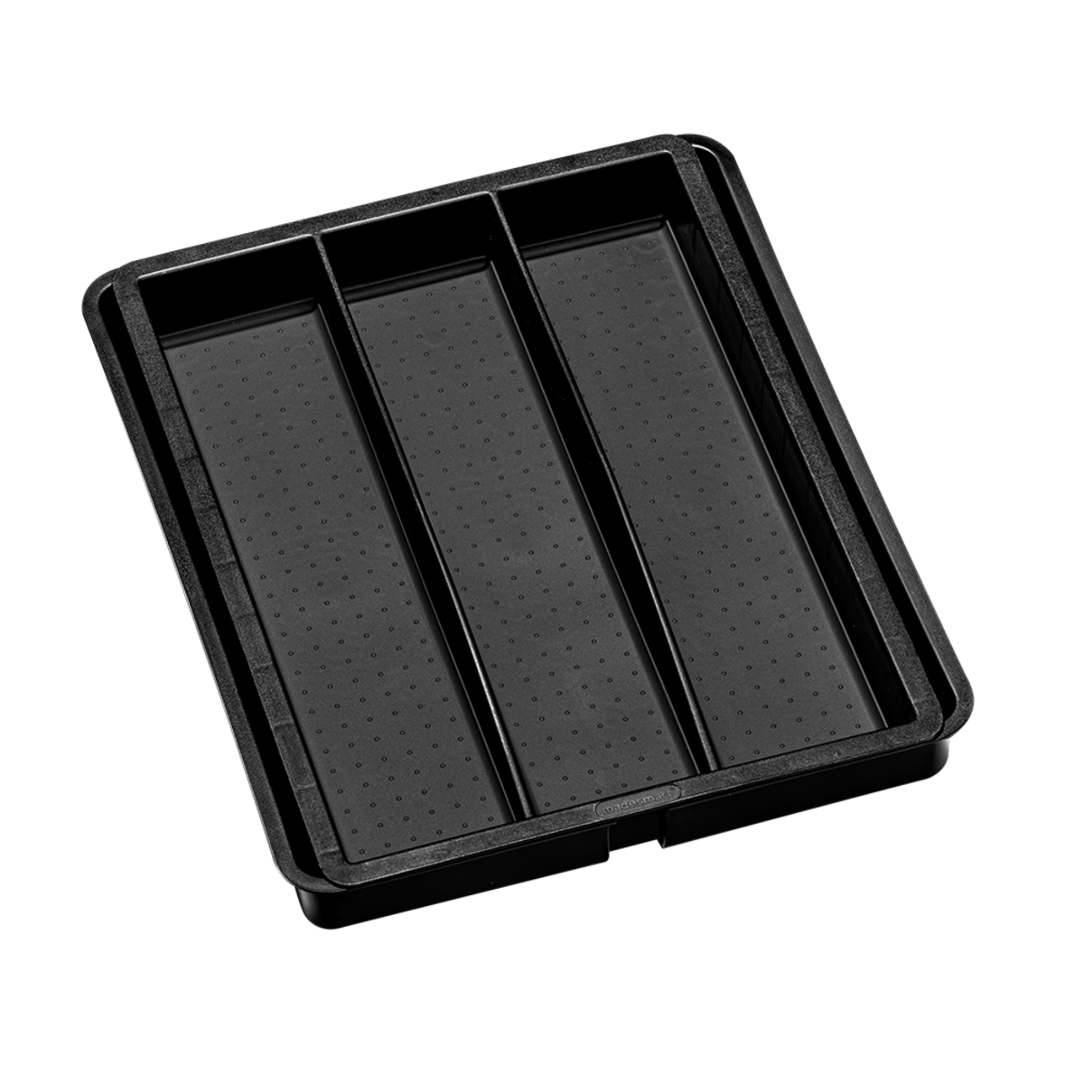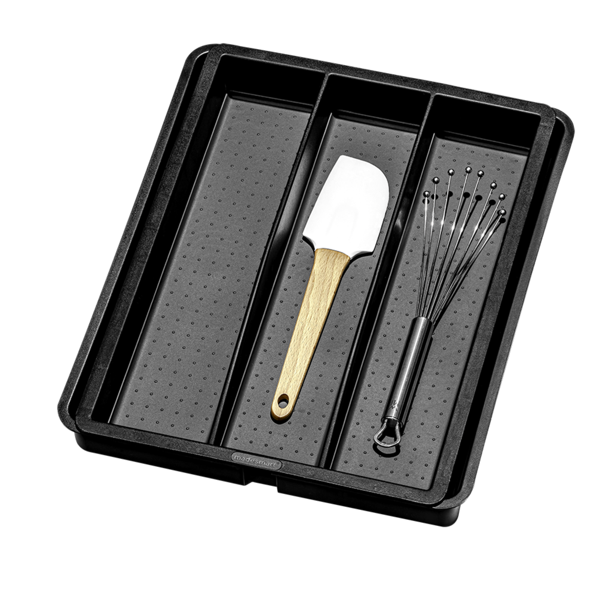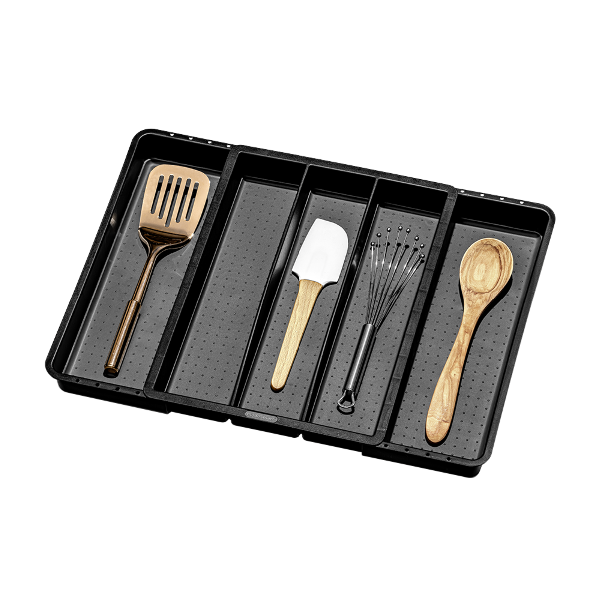 The expandable utensil tray comprises 5 compartments for easy organisation and can expand to fit in any kitchen drawer. Items stay in place thanks to a soft-grip lining and non-slip rubber feet.