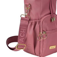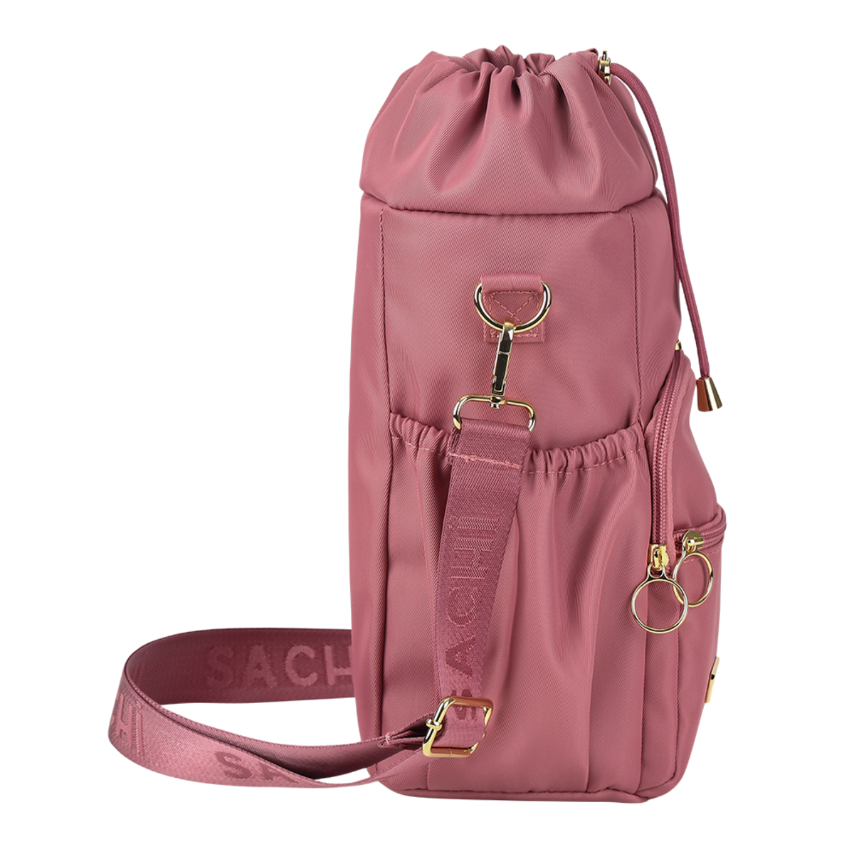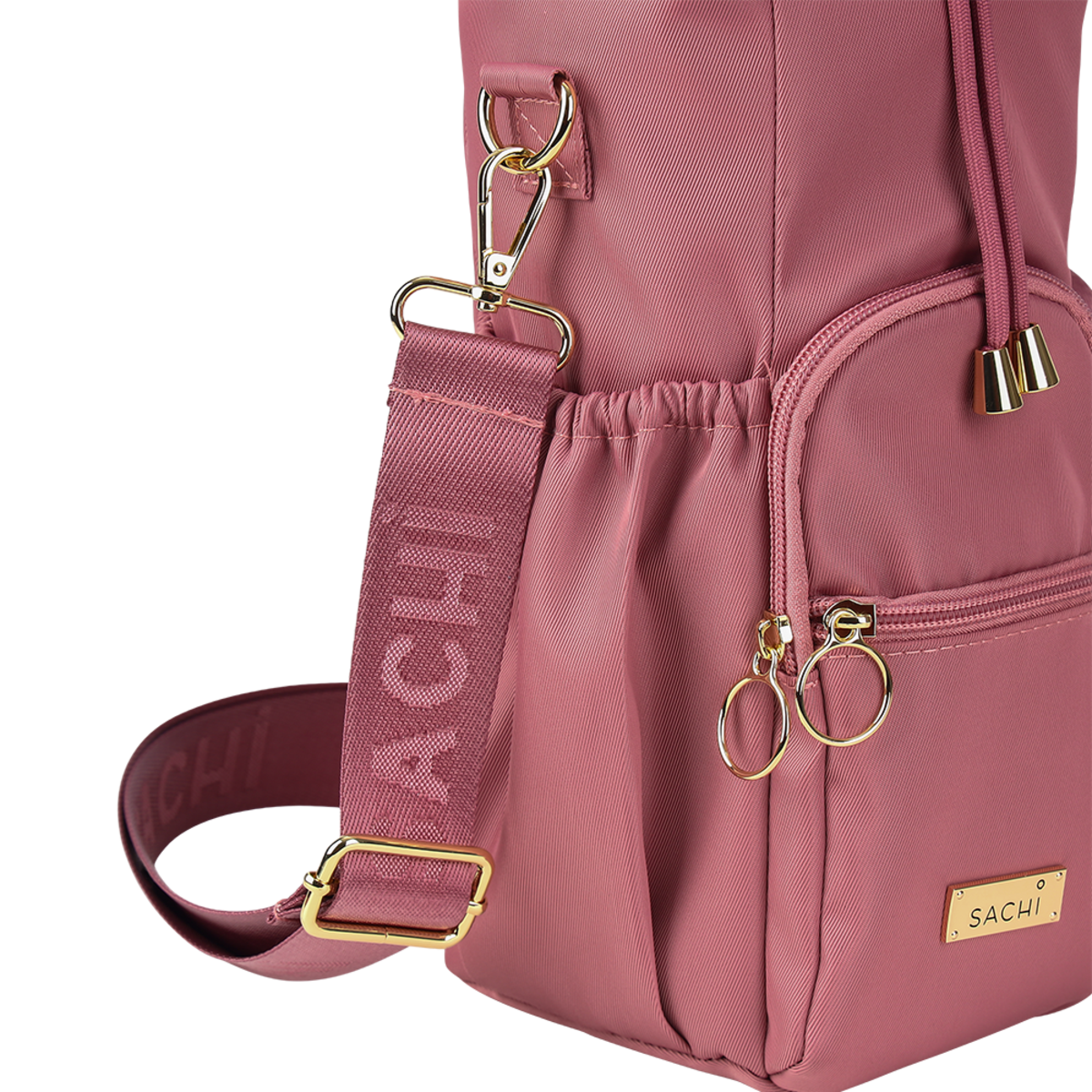 - Adjustable, removable crossbody strap featuring jacquard Sachi logo.