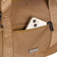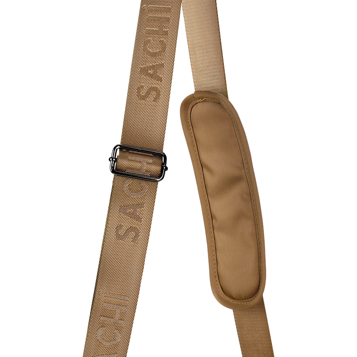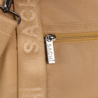 - Detachable, adjustable padded shoulder strap with jacquard Sachi branding.